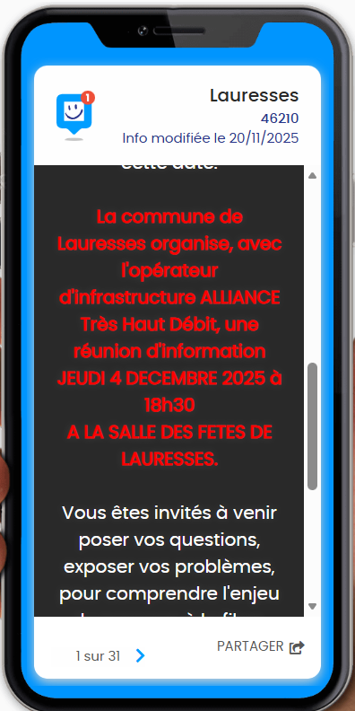 La commune une réunion d’information JEUDI 4 DECEMBRE 2025 à 18h30 A LA SALLE DES FETES DE LAURESSES.